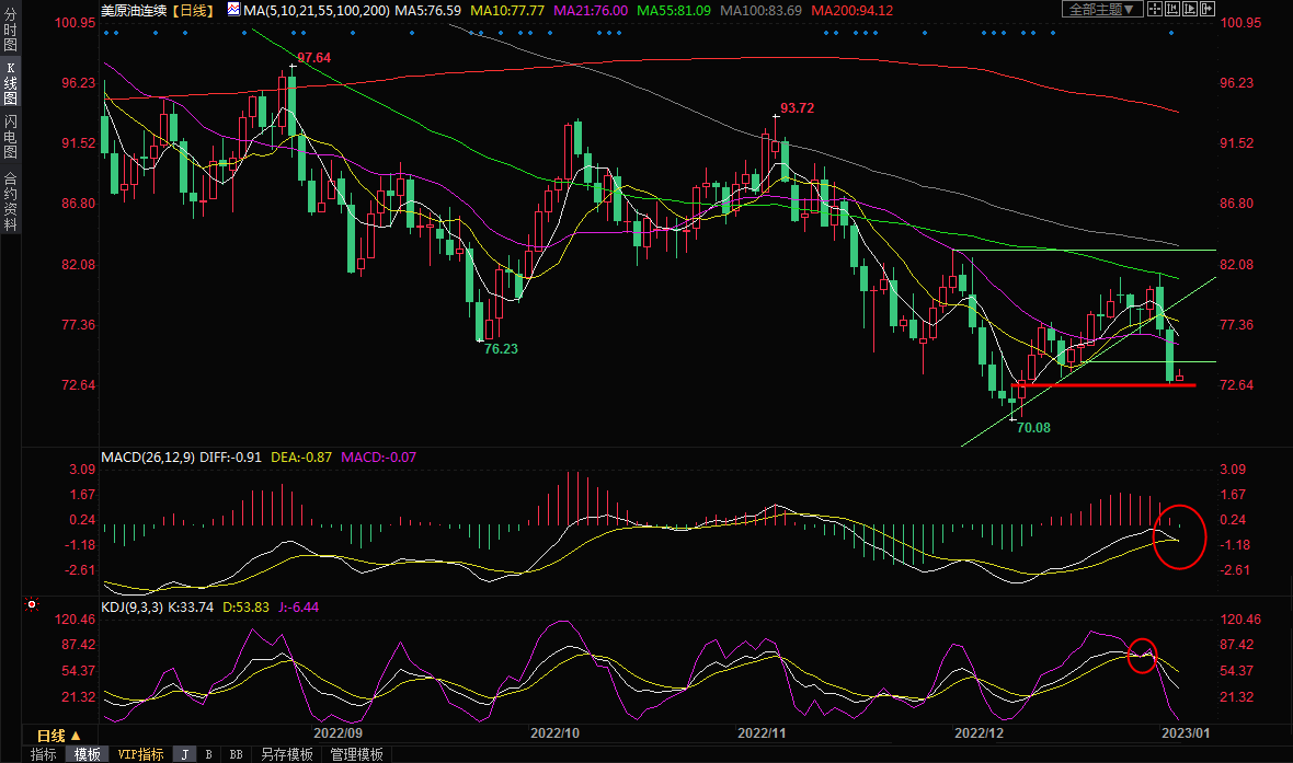 日线级别:震荡;油价在55日均线附近受阻后转跌,5日均线下穿10日均线结成死叉,KDJ死叉运行,MACD也有死叉趋势且出现绿色柱,油价失守21日均线后市加大跌势,短线偏向重新试探70整数关口附近支撑,12月份低点支撑也在该位置附近,如果下破该支撑,则后市可能会沿布林线下轨向下运行,进一步支撑在2021年12月21日低点68.56附近,2021年12月20日低点支撑在66.12附近,中线目标甚至可以看向2021年12月2日低点66.12附近。