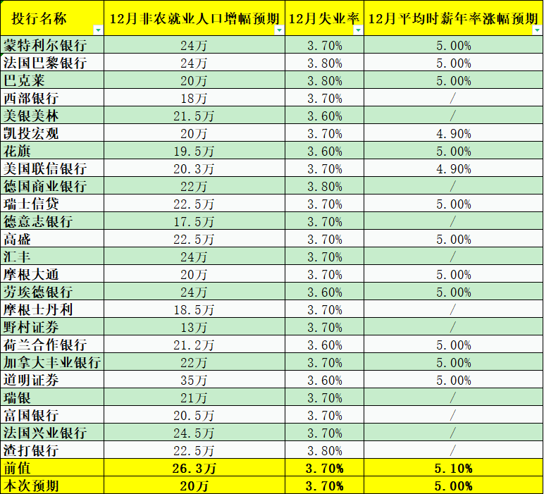 24家大型投行预测显示,主要投行认为12月非农增速进一步下滑,但投行之间的增幅预期差距较大。具体而言,投行预测美国12月季调后非农就业人口增幅料介于13万-35万(前值26.3万),失业率料介于3.6%-3.8%(前值3.7%),平均时薪年率增幅料介于4.9%-5.0%(前值5.1%)。
