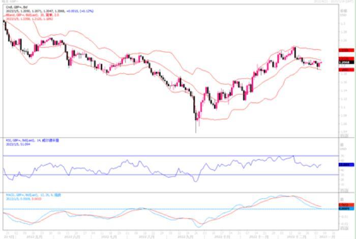 周三(1月4日)英镑兑美元上涨0.74%,盘中最高触及1.2087,收盘在1.2055。前个交易日英镑兑美元的下跌有点过度,并非特别合理,这是由清淡交易中的投机资金流所推动。周三当天,由于美联储公布的12月份会议纪录毫无新内容,美元回软英镑又回到了比较现实的水平。但是对于英国经济前景感到暗淡的情绪还是在市场上弥漫着,英国商会(BCC)周三表示,英国企业对2023年的前景感到悲观,因为他们面临着能源费用激增的可能性和脱欧后持续的贸易困难。因此,英镑兑美元也暂时得不到什么更好的利好因素来支撑其上行。从技术图形上观察,在日线级别图上,英镑兑美元已坠落在布林带通道中轨之下,技术指标倾向向下摆动。若汇价不能重返布林带中轨1.2130水平之上,则英镑兑美元短期内还是无法扭转其下行的态势,且一旦跌穿1.19-1.1880支撑区域,下行回撤幅度将加大。上方只有突破1.2130、1.2180这些阻力水平,方有望重回到上升的轨道之中。