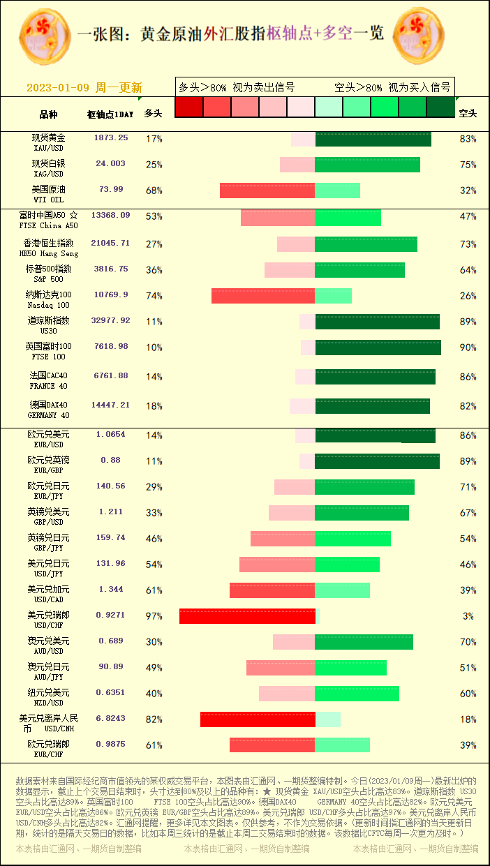 标题:一张图:黄金原油外汇股指"枢纽点+多空占比"一览(2023/01/09周一)