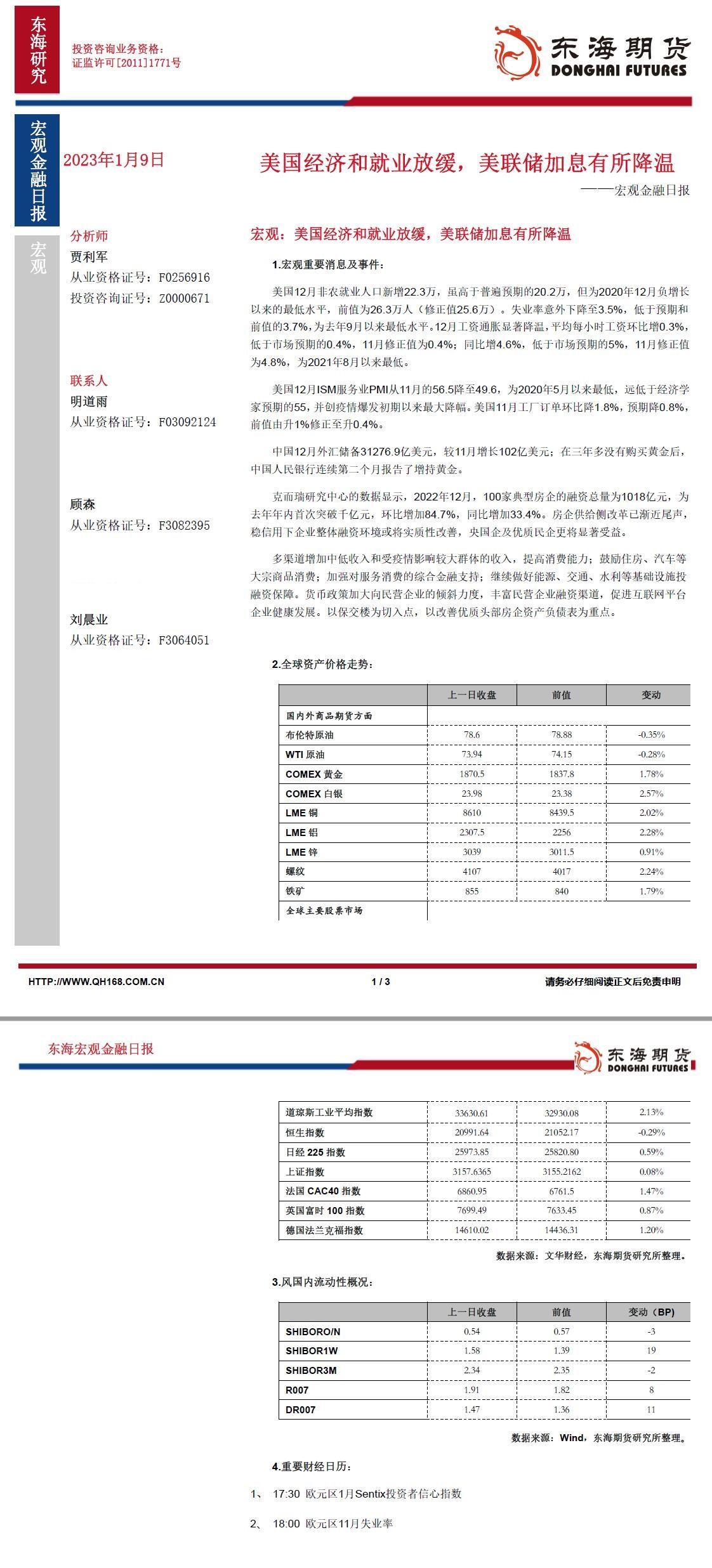 【东海期货1月9日宏观金融日报】美国经济和就业放缓,美联储加息有所降温