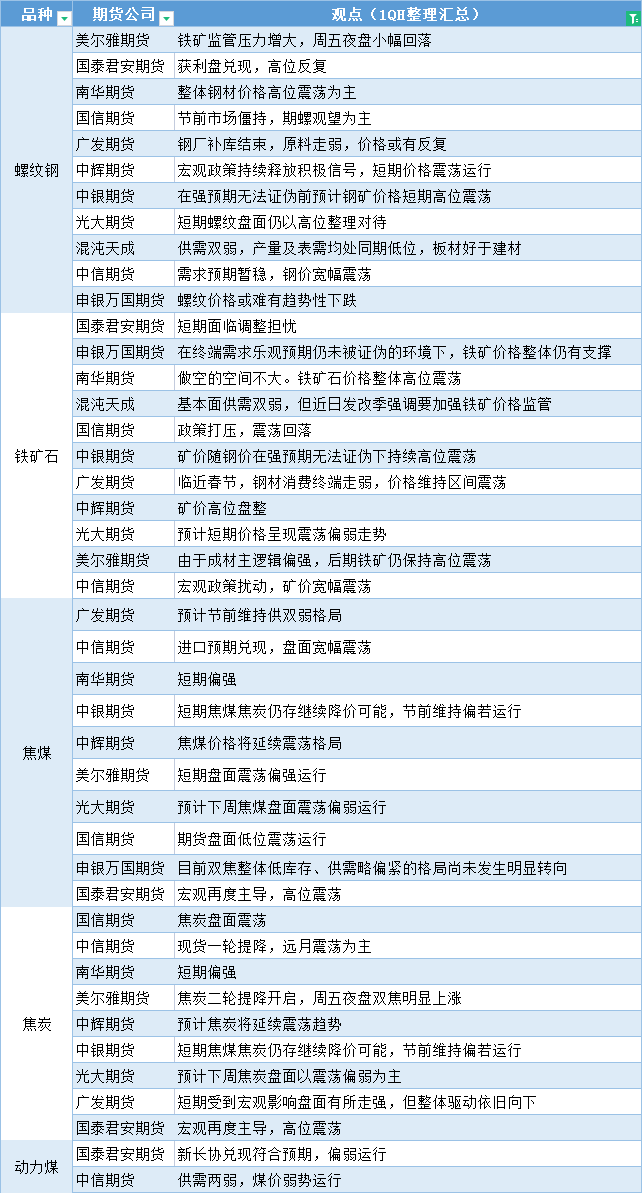 标题:期货公司观点汇总一张图:1月9日黑色系(螺纹钢、焦煤、焦炭、铁矿石、动力煤等)