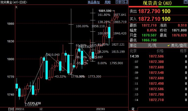 北京时间14:46,现货黄金上浮0.08%至1872.69美元/盎司;COMEX期金主力合约下沉0.05%至1876.8美元/盎司;美元指数上浮0.02%至103.210。