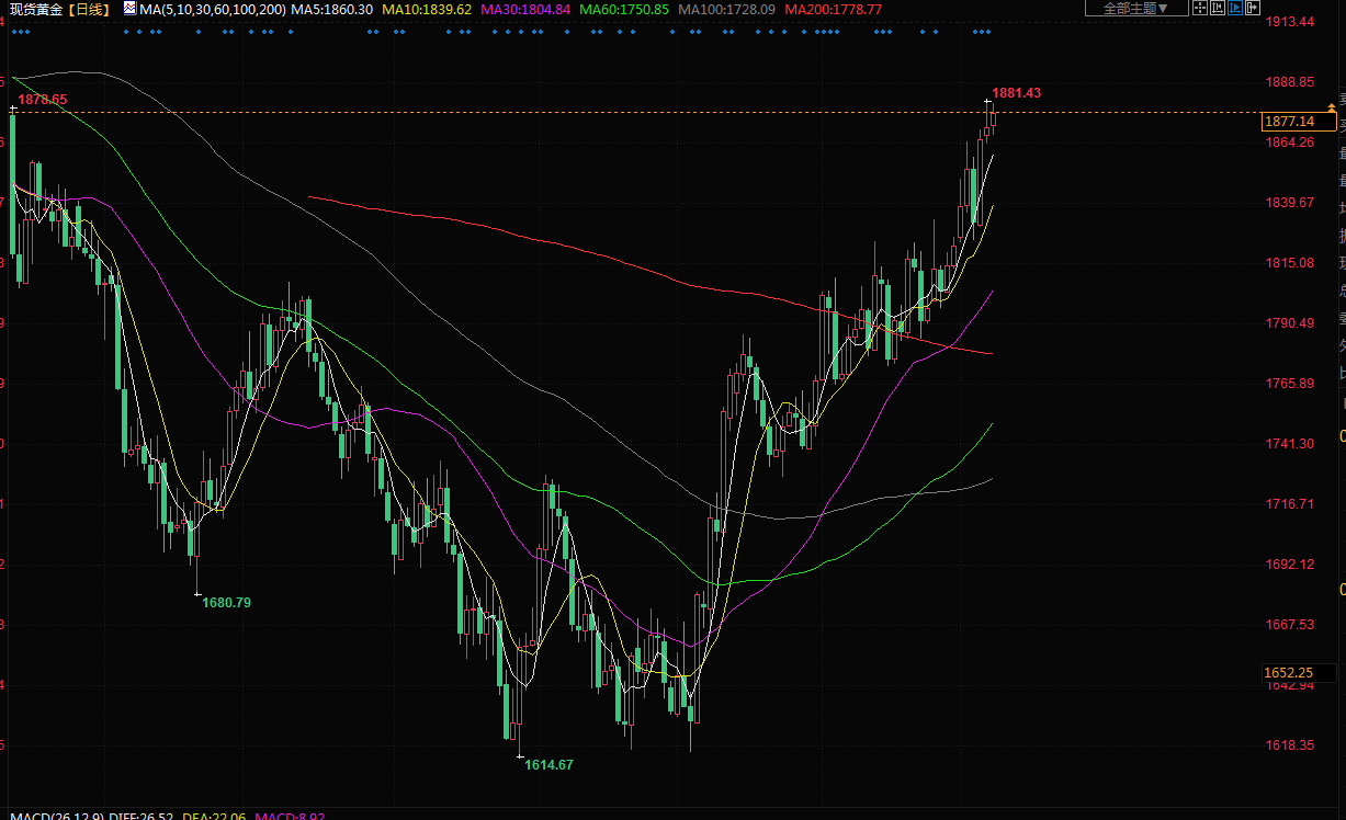 金价周二持于八个月高位附近,受助于美元趋软和对美国降息步伐放缓的希望,此前美联储主席鲍威尔未能就紧缩路径提供更多明确信息。现货金上涨0.2%,至每盎司1875.01美元,周一触及5月9日以来最高。