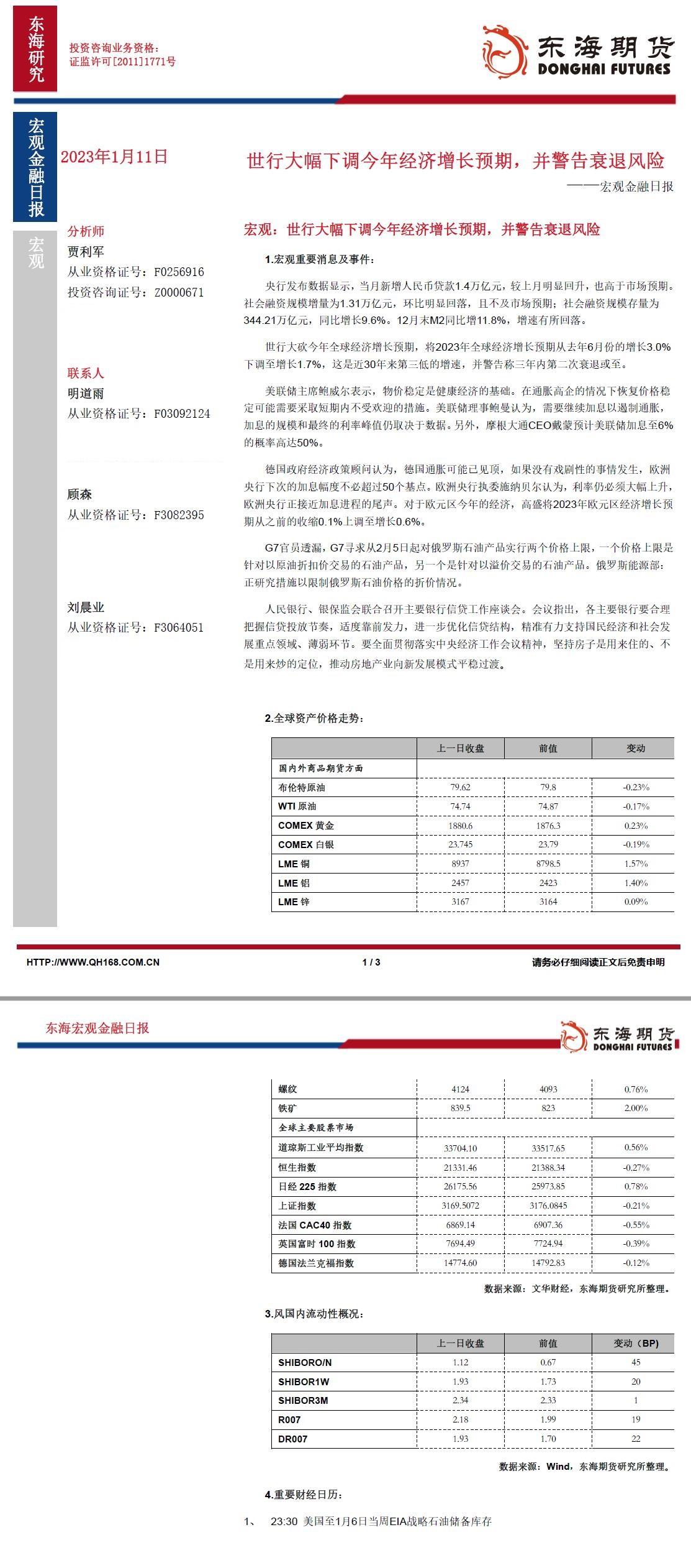 标题:【东海期货1月11日宏观金融日报】世行大幅下调今年经济增长预期,并警告衰退风险