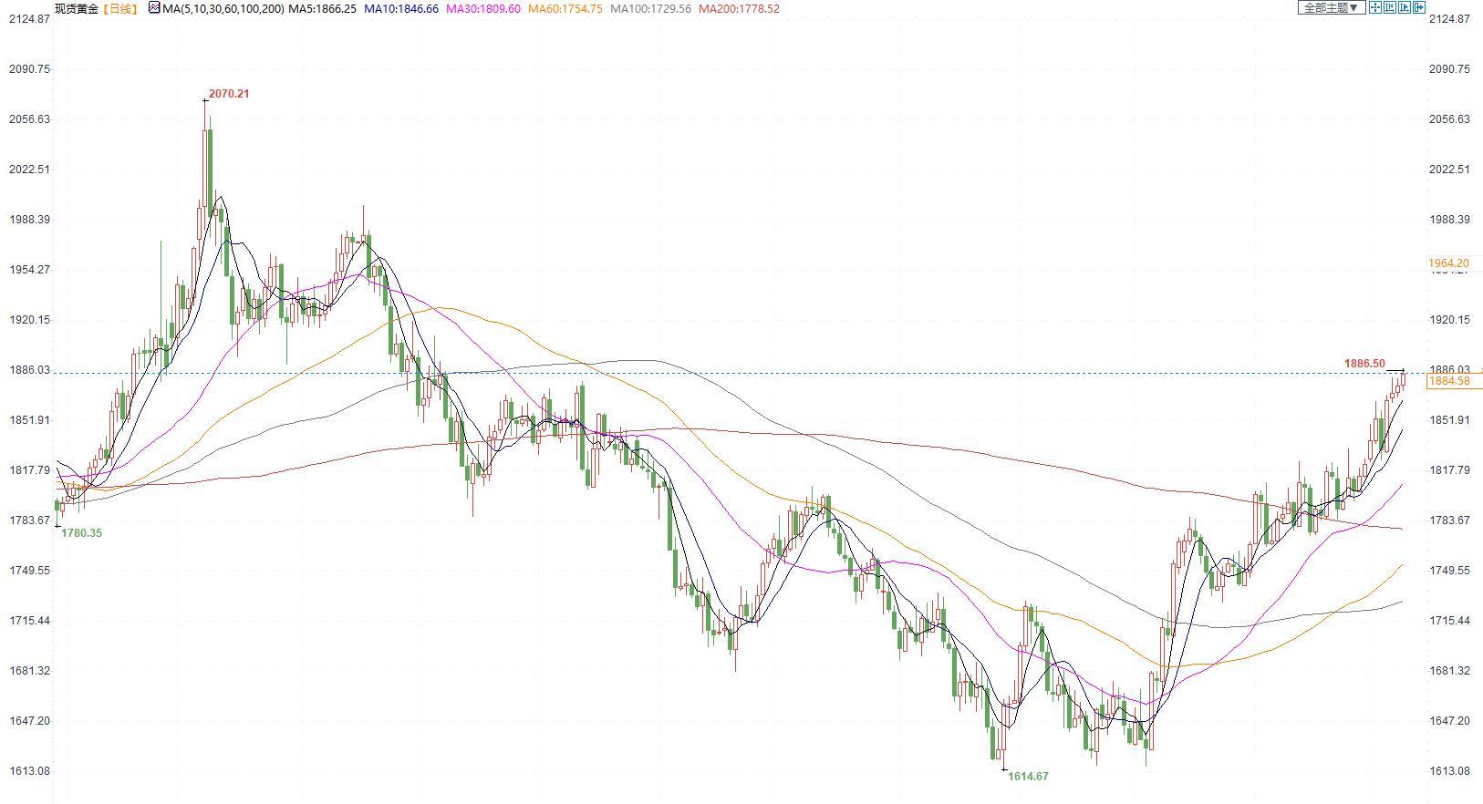 【今日行情】金银均小幅收涨。AU2304收盘价为414.80,收涨0.36%;AG2302收盘价为5239,收涨0.58%。美元指数在103上方窄幅震荡,十年期美债收益率有所回升至3.6%上方,中期两大指数预计均将弱势运行,对金银以支撑为主。