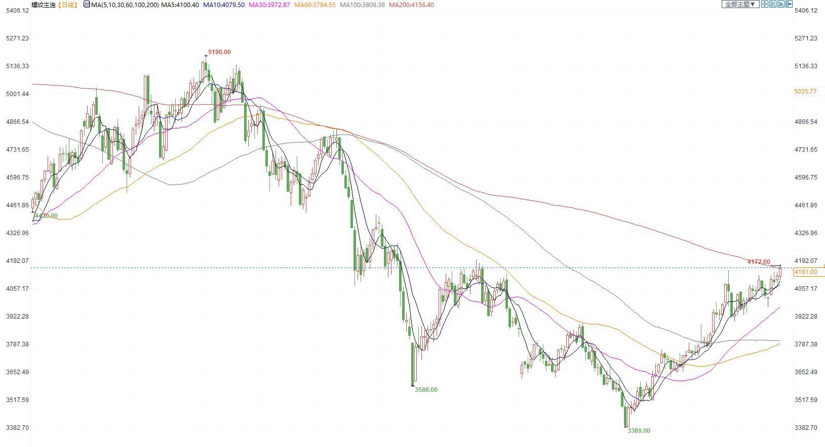 价格:受房地产宏观利好消息提振影响,今日黑色系各品种明显上涨。螺纹钢2305合约今日连续上行,尾盘冲新高4172。收盘价4161元/吨,较昨日结算价上涨52点,收涨1.27%。现货价格继续上涨,今日上海中天现货价为4140元/吨,环比增加20元/吨。