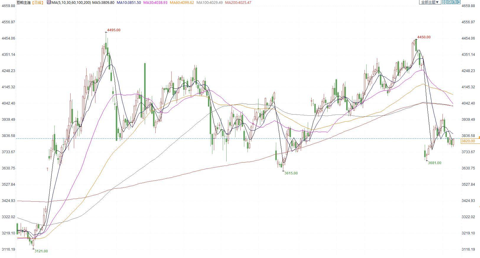 豆粕2305合约日内涨0.92%,收盘价3820元/吨,现货张家港43%蛋白豆粕4505元/吨