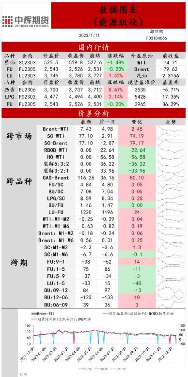 消息面:供需:美国石油协会(API)周二数据显示,截止1月6日的一周,原油库存增加1486.5万桶,汽油库存增加约180万桶,馏分油库存增加约110万桶;EIA小幅上调2023年全球原油需求增长预估,预计2023年全球石油需求增长为110万桶/日,较上月预估上调5万桶/日;Euroilstock周二公布数据显示,欧洲12月原油库存为4.3267亿桶,较11月下滑0.7%,汽油库存为1.0285亿桶,环比减少0.2%。