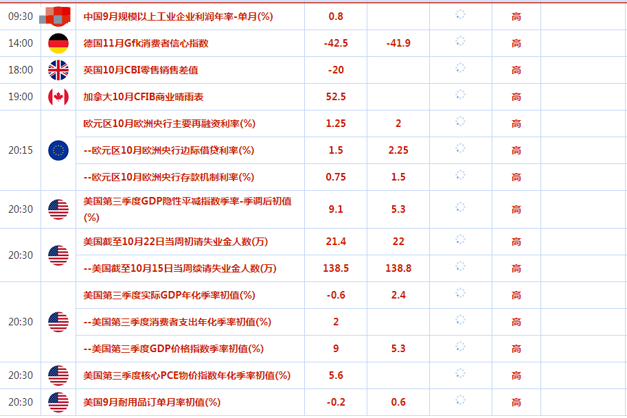 人们仍然普遍预计美联储将在11月加息75个基点?;平鸲悦拦噬仙叨让舾?,因为它们增加了持有非孳息黄金的机会成本。现在焦点转向周四的美国国内生产总值(GDP)数据,随后是周五的美国核心通胀数据,这些数据可能为美联储的加息轨迹提供更多清晰度。