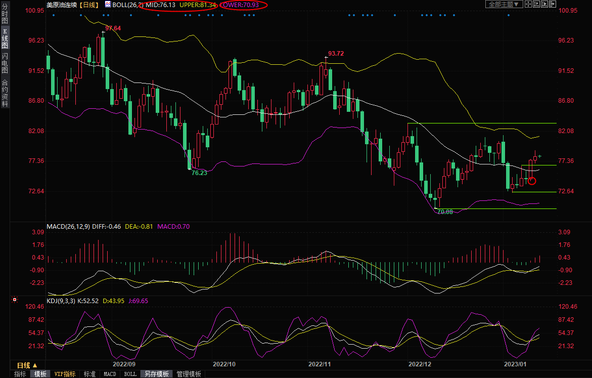 下方初步支撑在周一高点76.71附近,21日均线支撑也在该位置附近,布林线中轨支撑在76.13附近,周三低点支撑在74.28附近,若回落至该位置下方,则削弱短线看涨信号;进一步支撑在1月5日低点72.44附近。