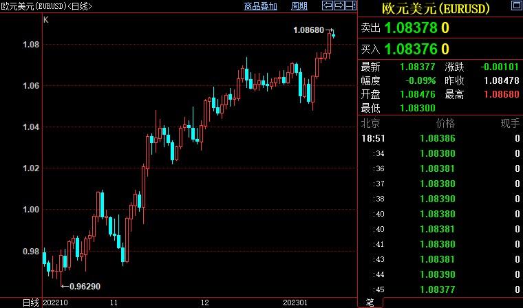 欧元兑美元上涨近1.9%,盘中创九个月高点1.0867。大涨势头除了建立在美联储加息立场可能松动的预期上之外,也建立在欧洲央行料坚守打击通胀立场之上。