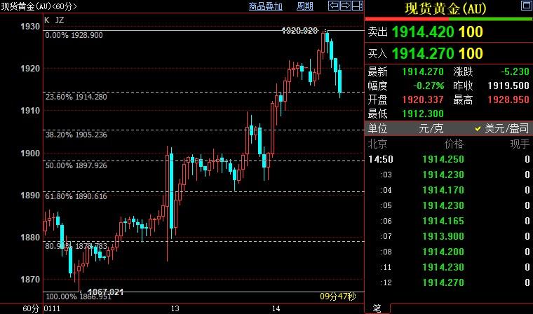 北京时间14:56,现货黄金下跌0.20%至1916.12美元/盎司;COMEX期金主力合约下跌0.12%至1919.3美元/盎司;美元指数下沉0.05%至102.12。