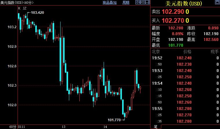 北京时间19:55,现货黄金下跌0.16%至1916.95美元/盎司;COMEX期金主力合约下跌0.09%至1920.0美元/盎司;美元指数上涨0.10%至102.281。