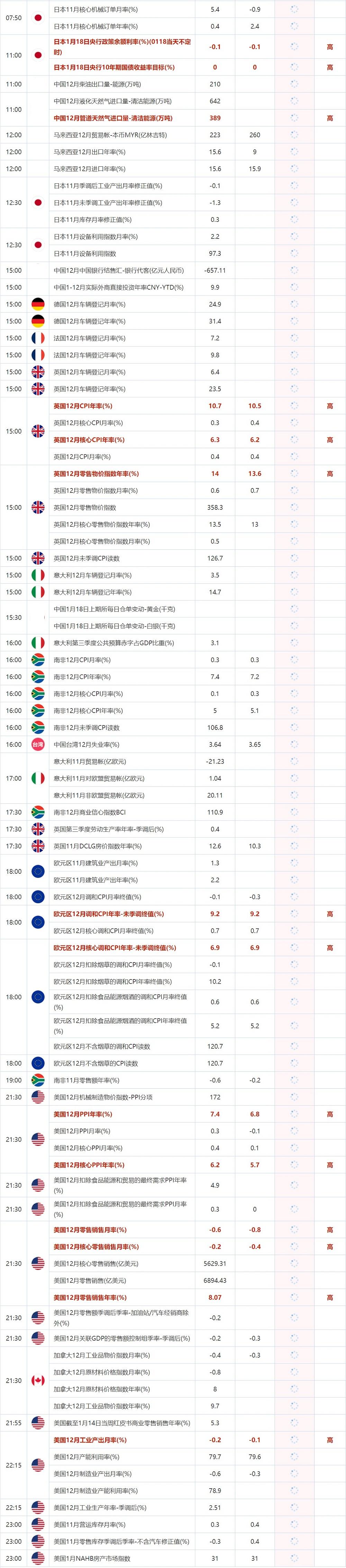 15:00?英国12月CPI年率(%)?,?前值?10.7?,?预期值?10.5?,?公布值:待发布