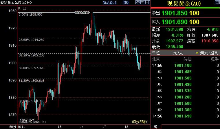 北京时间14:58,现货黄金下跌0.31%至1902.44美元/盎司;COMEX期金主力合约下跌0.29%至1904.3美元/盎司;美元指数上涨0.29%至102.661。