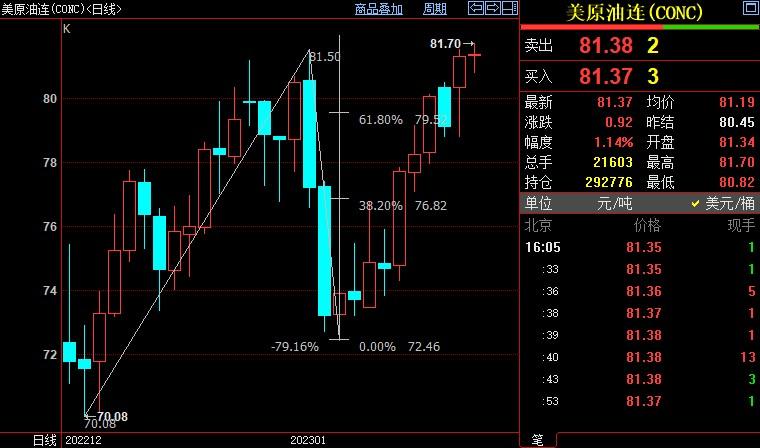 北京时间16:09,NYMEX原油期货上浮1.16%至81.11美元/桶;ICE布伦特原油期货上涨0.93%至86.89美元/桶。两市盘中均创12月5日以来新高,分别至81.70美元/桶和87.16美元/桶。