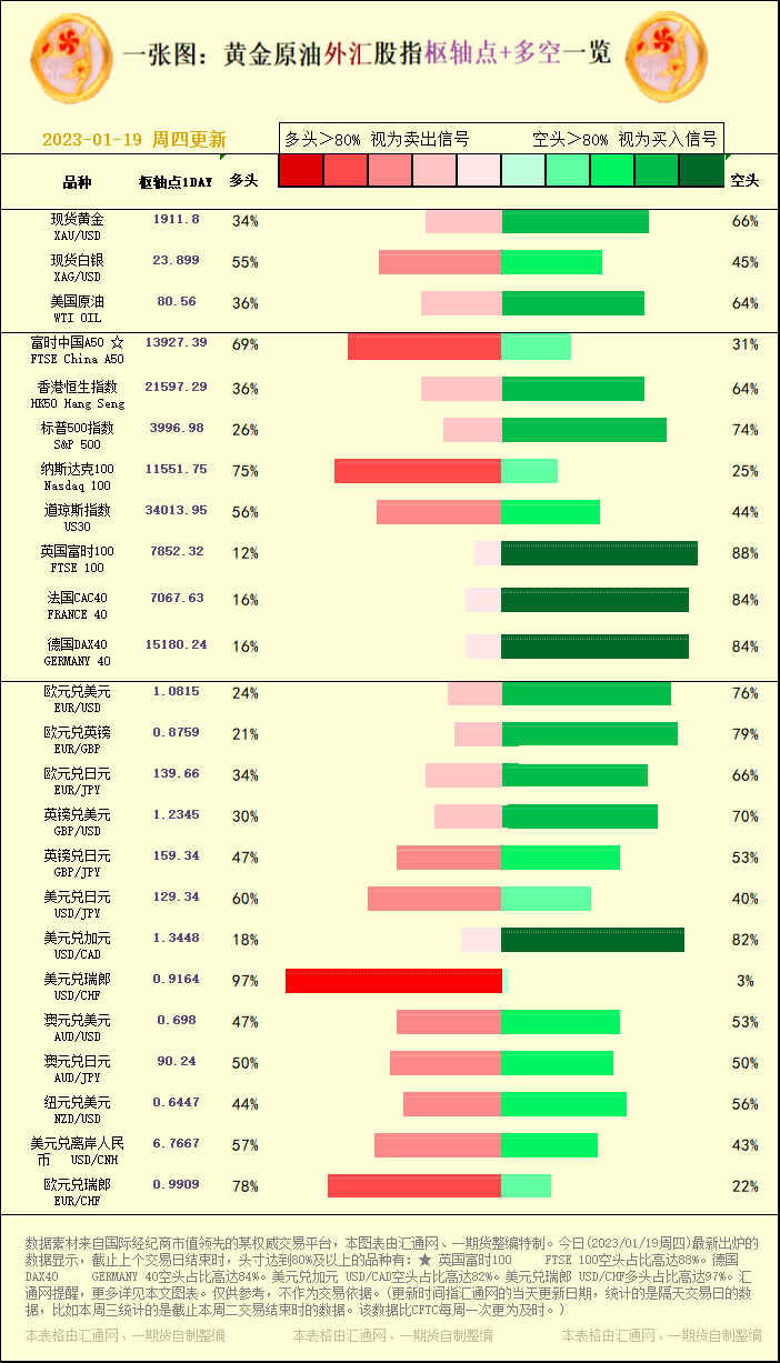 一张图:黄金原油外汇股指"枢纽点+多空占比"一览(2023/01/19周四)