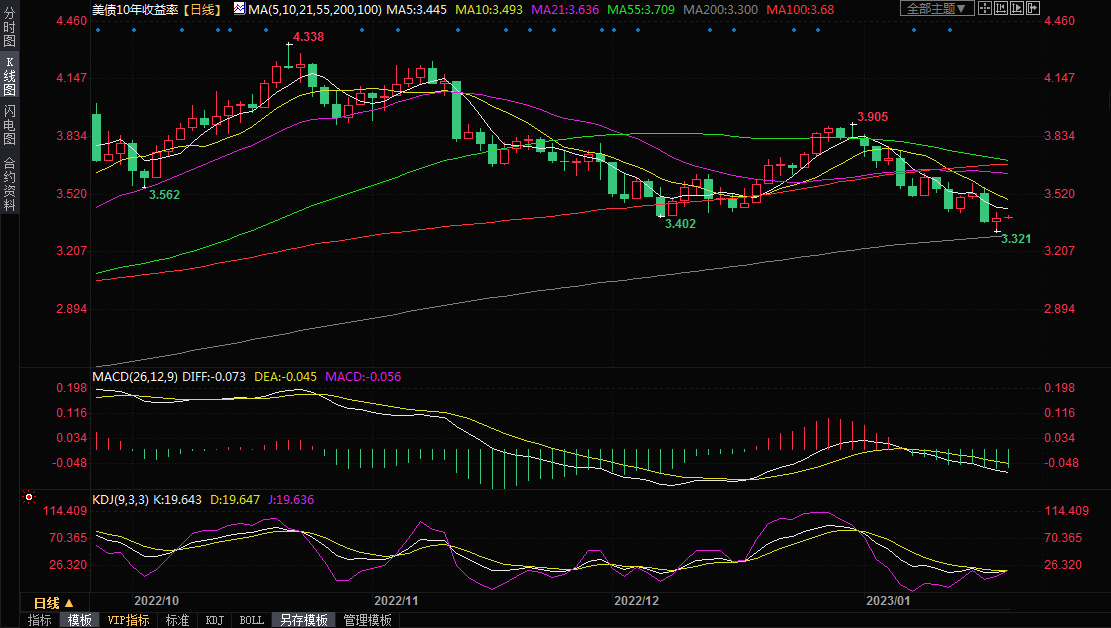 10年期国债收益率周四尾盘报3.397%,稍早一度跌至3.321%,为9月13日以来最低。200天移动均线切入位为3.292%。收益率已从年底的3.905%以及10月21日触及的15年高点4.338%回落。两年期国债收益率周四尾盘为4.118%,稍早触及10月4日以来最低4.041%。
