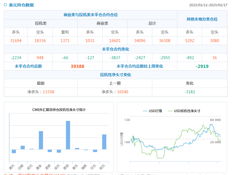 贵金属方面,截至1月17日当周,投机者所持COMEX黄金净多头头寸增加10783手合约,至93357手合约,创最近约九个月新高。所持COMEX白银净多头头寸增至28042手合约,所持COMEX铜净多头头寸增至35248手合约创最近逾九个月新高。所持NYMEX铂金净多头头寸降至16897手合约创最近10周新低,所持NYMEX钯金净空头头寸增至1959手合约创最近约六个月新高。