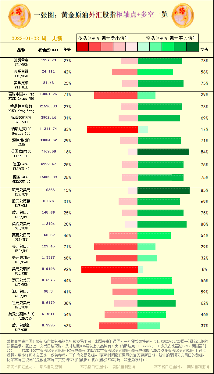 一张图:黄金原油外汇股指"枢纽点+多空占比"一览(2023/01/23周一)