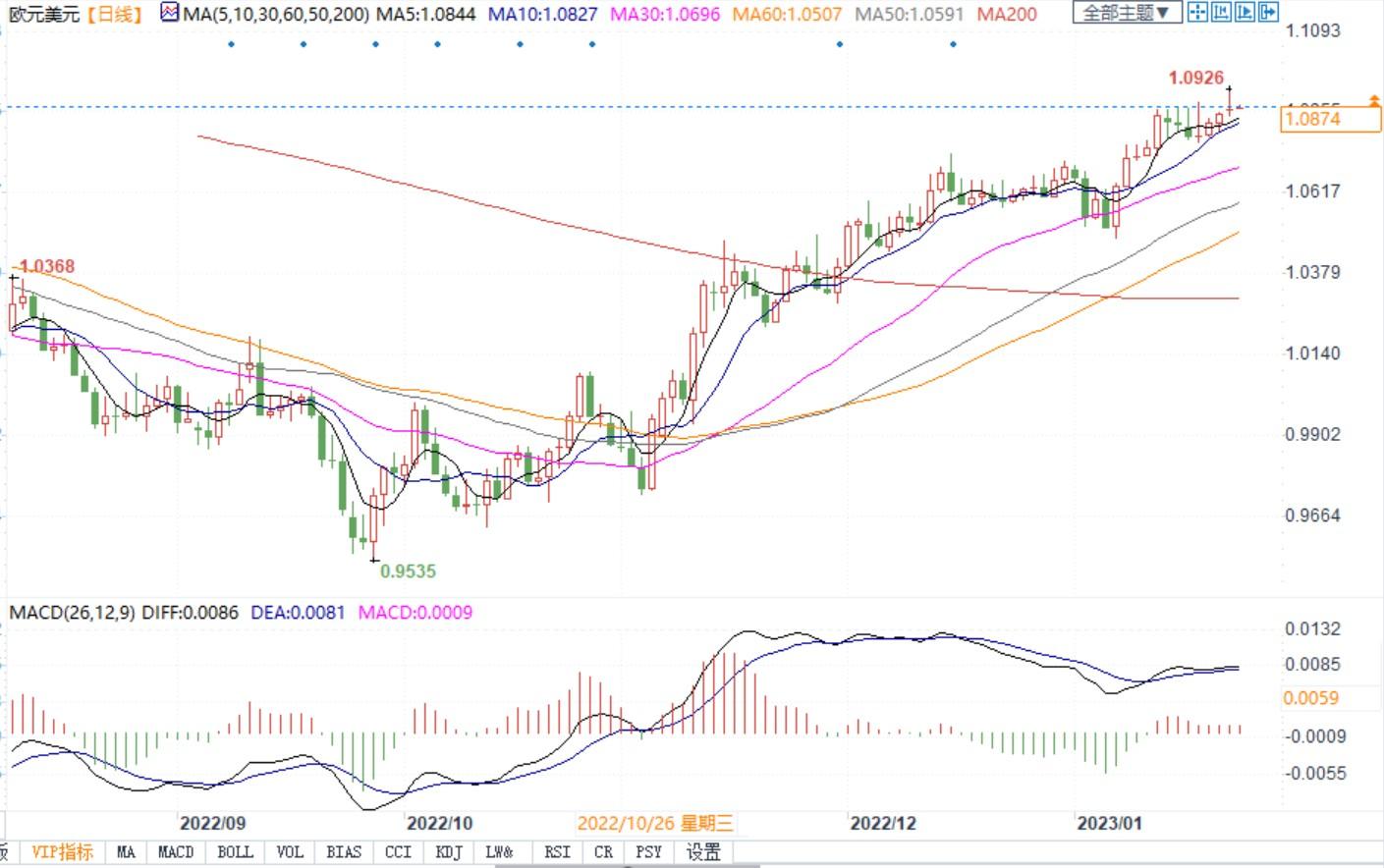 欧洲央行管理委员会官员诺特(Klaas?Knot)上周日接受采访时表示,欧洲央行将在2月和3月加息50个基点,并将在接下来的几个月内继续加息。他还表示,放慢加息步伐的时间“还很遥远”。欧元兑美元闻讯上涨,周一一度触及九个月来最高水平1.0926。