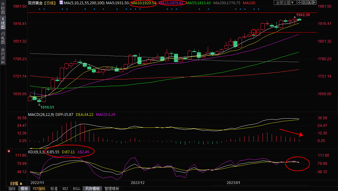 K线连续三个交易日接近十字星,也暗示上方阻力极强,短线需要提防金价短线见顶风险,初步支撑在10日均线1920.60附近,本周低点支撑目前在周一低点1911.25美元附近,然后是1900整数关口附近,1月11日高点支撑在1886.50附近,强支撑在21日均线1879.82附近,若失守该支撑,则增加见顶观点。