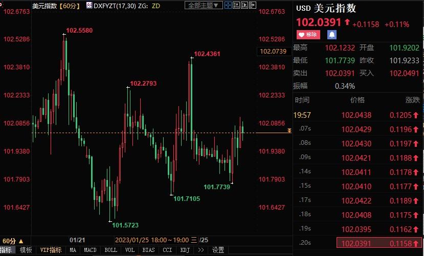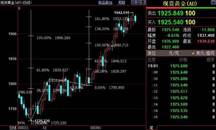 北京时间19:56,现货黄金下跌0.60%至1925.45美元/盎司;COMEX期金主力合约下跌0.47%至1926.2美元/盎司;美元指数上浮0.12%至102.040。