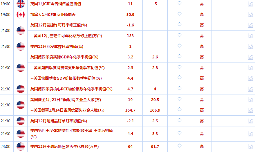 美国商务部预计将于周四公布第四季国内生产总值(GDP)初步预估值,这可能为美联储1月31日至2月1日的政策会议定下基调。美国周度初请失业金人数、新屋销售和耐用品订单数据也在周四出炉。
