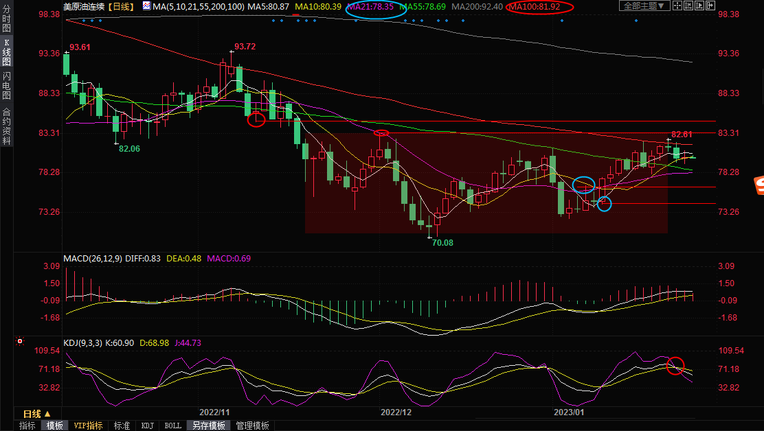 日线级别:震荡;油价受到布林线上轨和100日均线等多重阻力压制,KDJ重新结成死叉,相对高位油价也形成了类似“黄昏之星”顶部信号,油价短线偏向震荡下行,21日均线支撑在78.35附近,若失守该支撑,则增加短线看空信号;1月9日高点支撑在76.71附近,1月11日低点支撑在74.28附近。