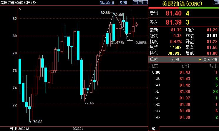 北京时间16:11,NYMEX原油期货上涨0.53%至81.44美元/桶;ICE布伦特原油期货上涨0.45%至87.67美元/桶。