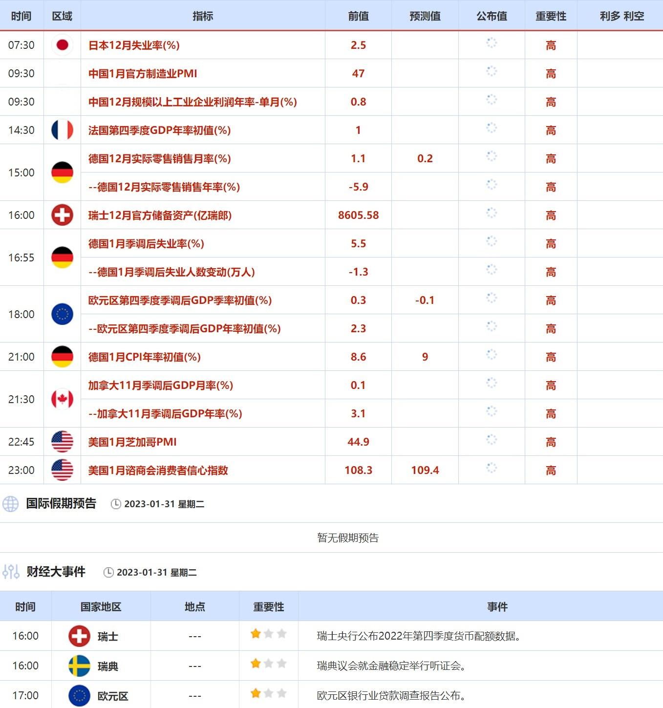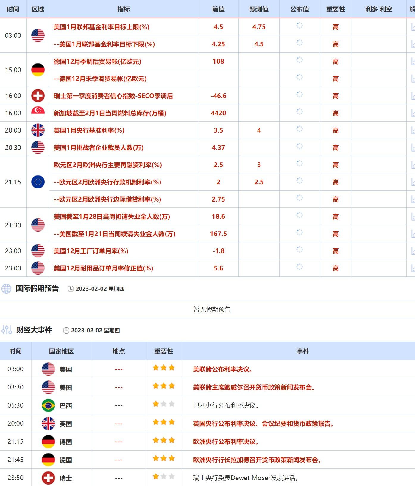 2月2日,投资者需关注美联储、英国央行和欧洲央行利率决议。目前市场预期当天美联储加息25个基点,英国央行加息50个基点,欧洲央行加息50个基点。此外,投资者需关注美联储主席鲍威尔和欧洲央行行长拉加德召开的新闻发布会。?