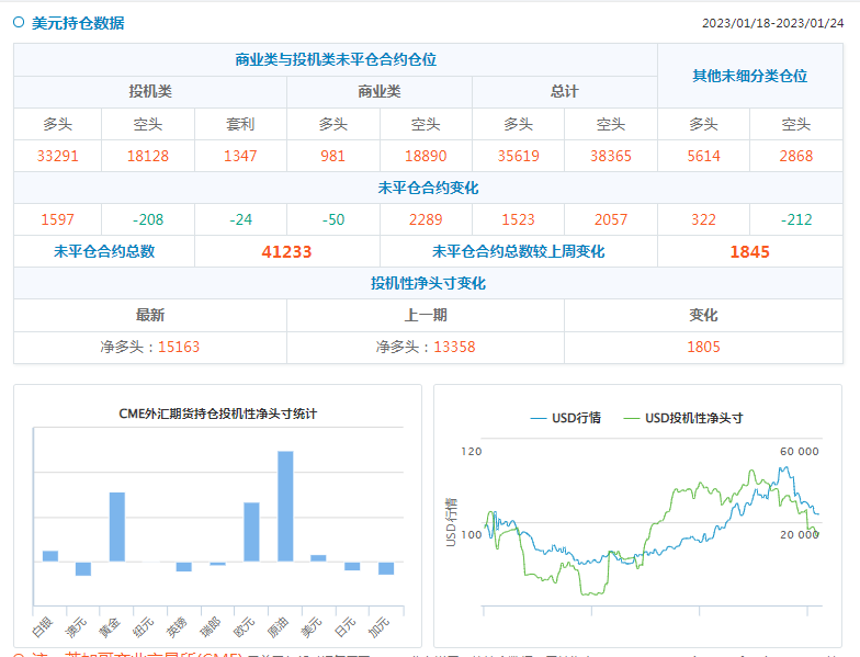贵金属方面:截至1月24日当周,COMEX黄金投机者将净多头头寸增加13273手,至106631手,白银投机者将净多头头寸减少7119手,至20923手,铜投机者将净多头头寸增加5867手,至41116手。