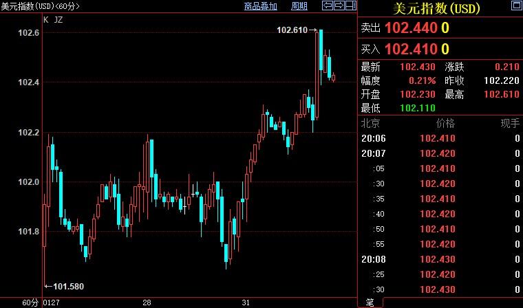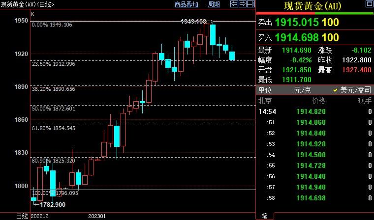 北京时间20:08,现货黄金下跌1.13%至1901.38美元/盎司;COMEX期金主力合约下跌1.16%至1916.7美元/盎司;美元指数上浮0.21%至102.426。