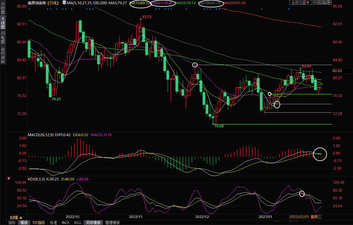 日线级别:震荡;油价此前在100日均线附近受阻,维持宽幅震荡走势,目前油价回落至10日均线下方,5日均线下穿10日均线结成死叉,MACD初步死叉,KDJ死叉,短线略微偏向震荡下行,初步支撑在21日均线78.40附近,较强的支撑在隔夜低点76.54附近,如果跌破该支撑,则增加短线看空信号。1月11日低点支撑在74.28附近,1月5日低点支撑在72.44附近。