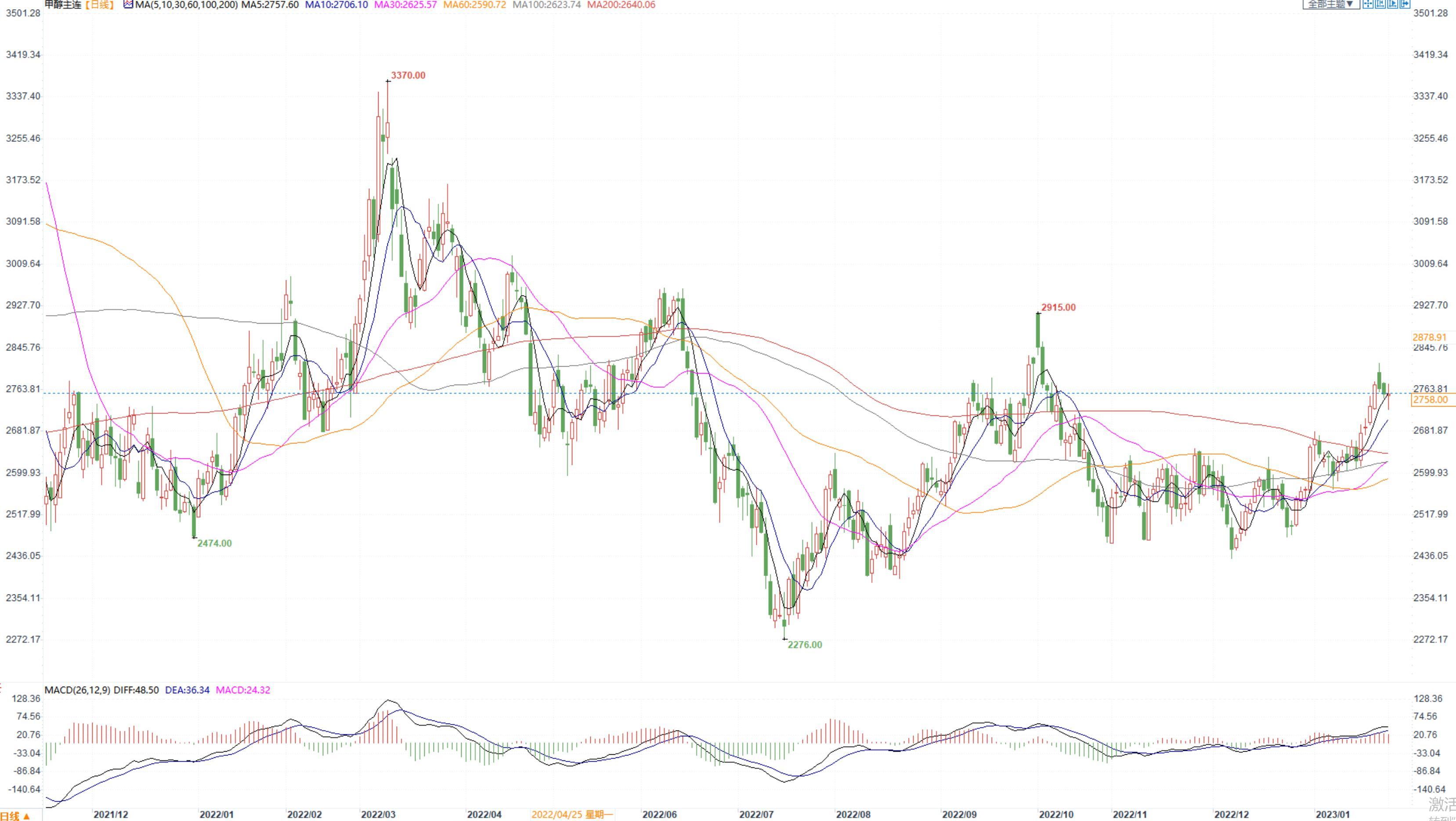期货市场,甲醇2305合约小幅收涨,收盘价2758。张家港地区参考价格2800-2810元/吨附近现汇出罐。