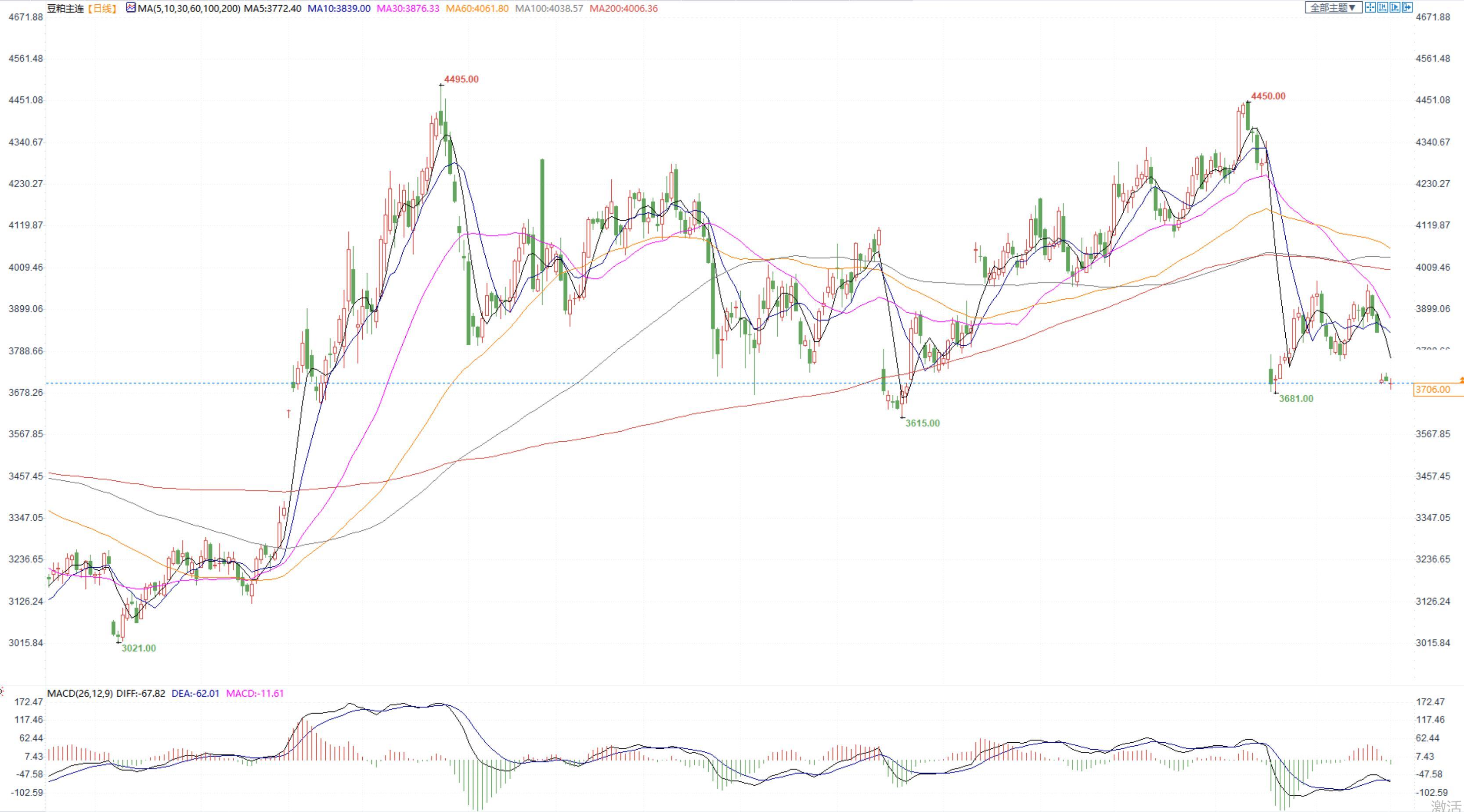 豆粕2305合约日内跌0.69%,收盘价3890元/吨,张家港市场豆粕4600元/吨。