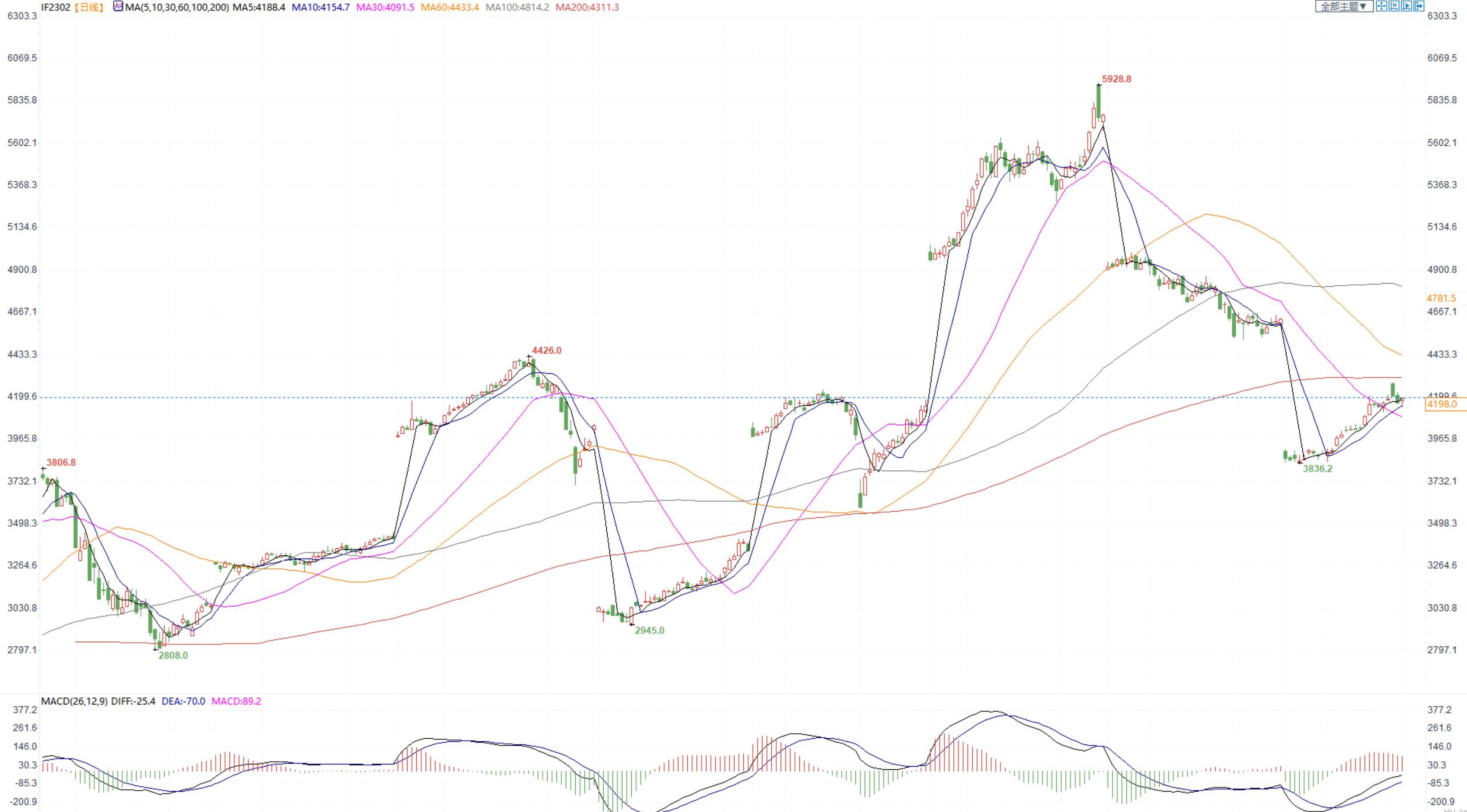 【今日涨跌】四大期指全线收涨。IH2302收盘价为2827.8,收涨0.26%;IF2302收盘价为4198.0,收涨0.57%;IC2302收盘价为6361,收涨0.81%;IM2302收盘价为6922.6,收涨1.50%。