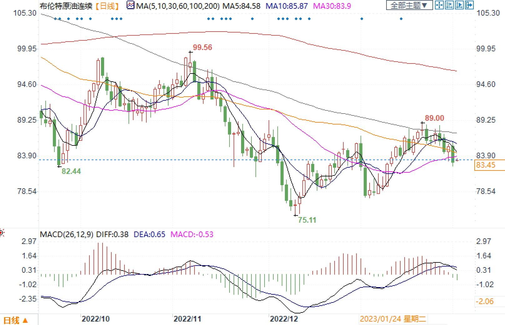 北京时间2月2日14:00,布伦特原油连续报83.36美元/桶