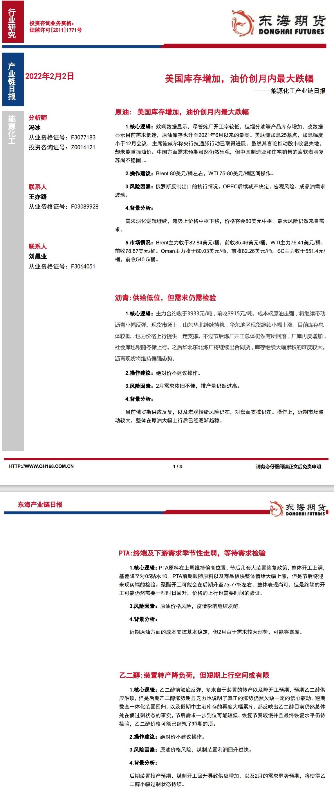 标题:【东海期货2月2日产业链日报】能化篇:美国库存增加,油价创月内最大跌幅