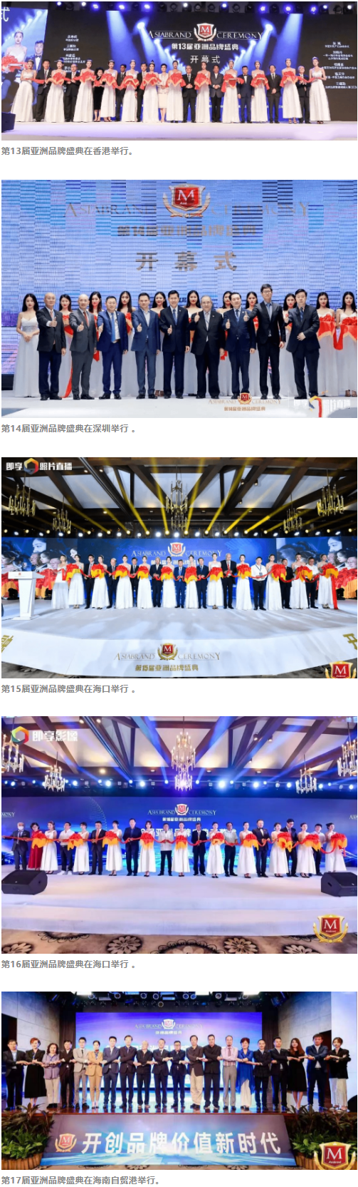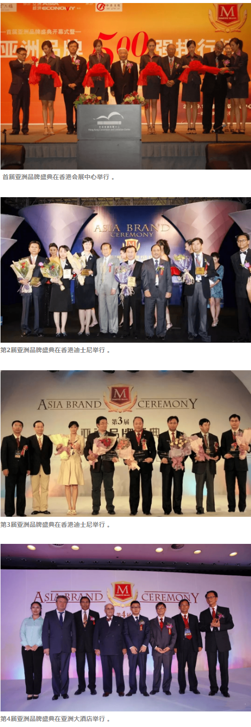 亚洲品牌盛典已成功举办17届,享有亚洲品牌年度“奥斯卡”的美誉,得到来自中国、日本、韩国、印度、泰国、新加坡、马来西亚等亚洲众多国家以及中国香港、澳门、台湾等地区政要名流、行业协会组织和知名企业的积极支持和踊跃出席。迄今为止,服务于数千家亚洲知名企业。已聚焦国内外300万次全方位持续报道,6000个品牌传扬世界,18000多位各界与会嘉宾,见证了1000家品牌价值5亿以上的企业成长历史,已成为亚洲品牌年度盛宴和品牌国际化推广的桥梁。
