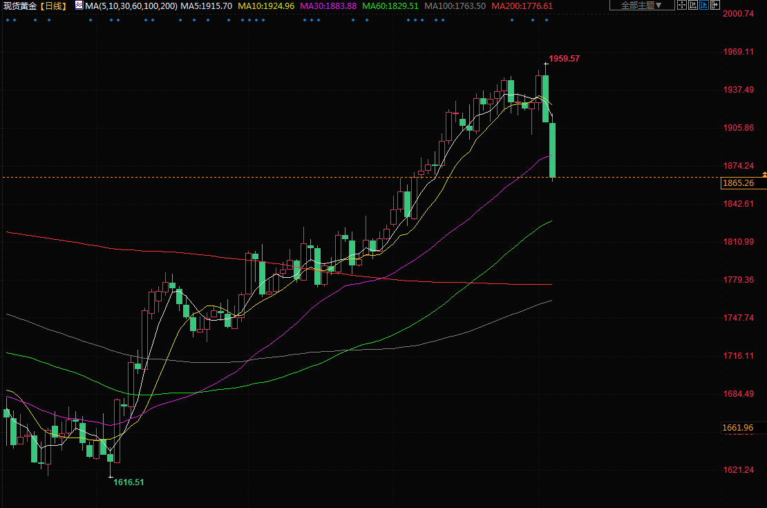商品收盘情况:布伦特原油期货下跌2.7%,报每桶79.94美元;美国原油期货收跌3.3%,报73.39美元,美国期金结算价下跌2.8%至1876.6美元。