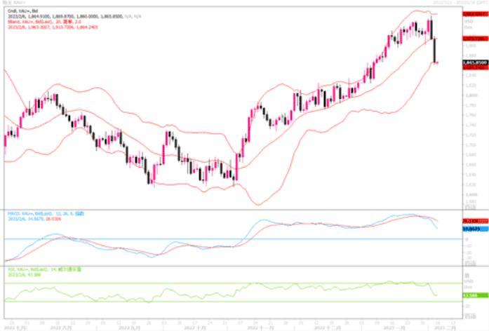 金价在上周跌破自去年11月以来的关键支撑线(在1878美元/盎司附近),至少目前来看,看涨倾向有所回落。从黄金日线图来看,相对强弱指数(RSI)跌破50,目前位于40;加之MACD指标传递看跌信号,这些因素都支持金价看空预期。去年12月多个高点组成的区域(在1825-23美元/盎司附近),可能成为黄金买家的最后防线。