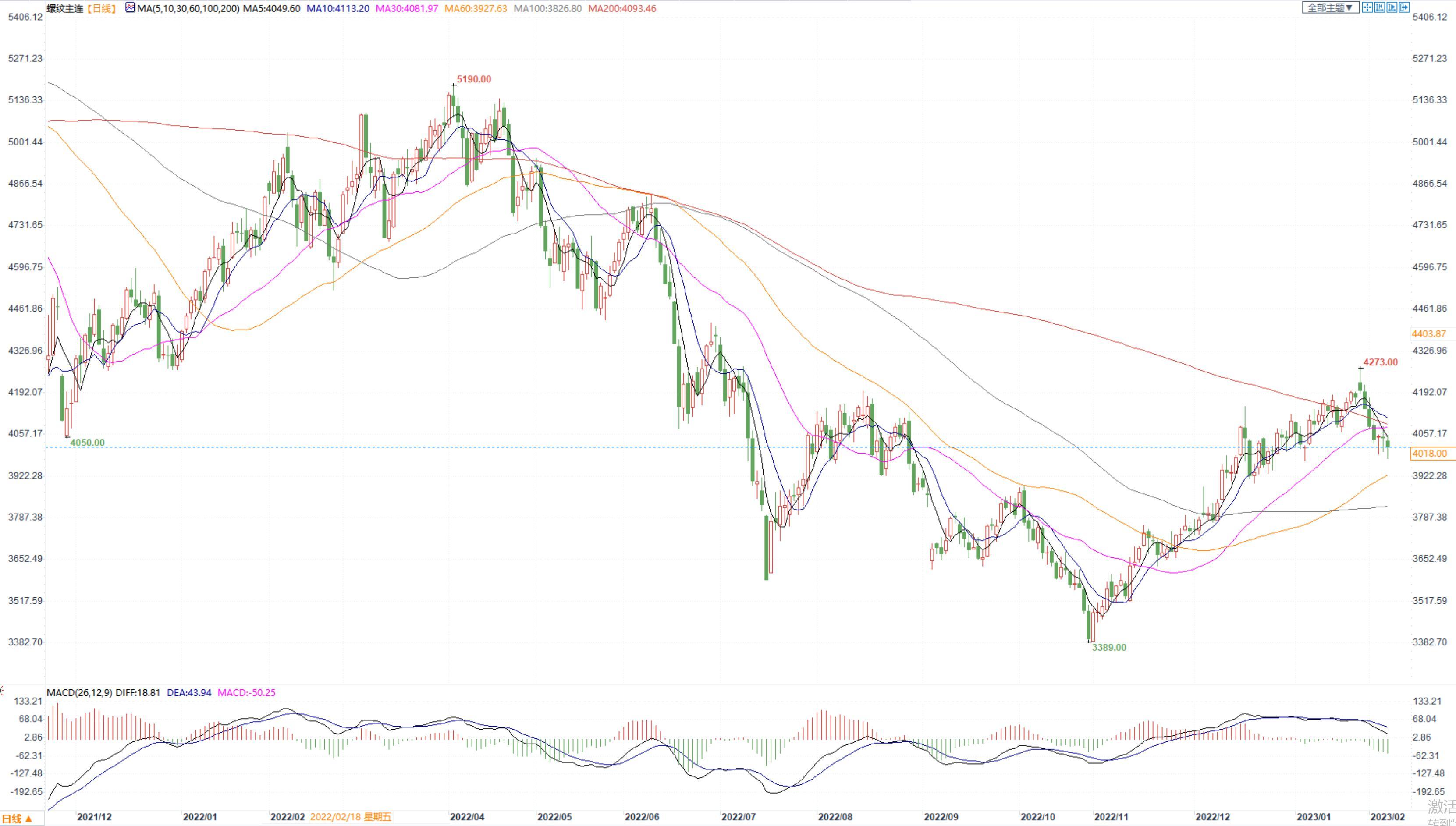 价格:螺纹钢2305合约今日继续走弱,一度再次跌破4000点,创最近新低3978。午后出现小幅回升,收盘价4018元/吨,收跌0.47%。上海中天现货价为4120元/吨,环比下降20元/吨。