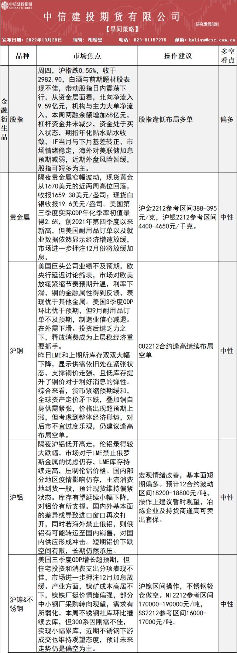 沪铝:隔夜沪铝低开高走,伦铝录得较 大跌幅。市场对于LME禁止俄罗 斯金属的忧虑仍存,LME库存持 续走高,压制伦铝价格。国内部 分地区疫情影响仍存,主流消费 地到货一般,预计现货维持偏紧 状态。库存有望延续小幅下降, 对铝价有所支撑。国内外基本面 的差异或导致进口窗口再次打 开,同时若海外禁止俄铝,则俄 铝有可能转运至国内销售,对国 内供应形成冲击。短期铝价下跌 空间有限,长期仍然承压。