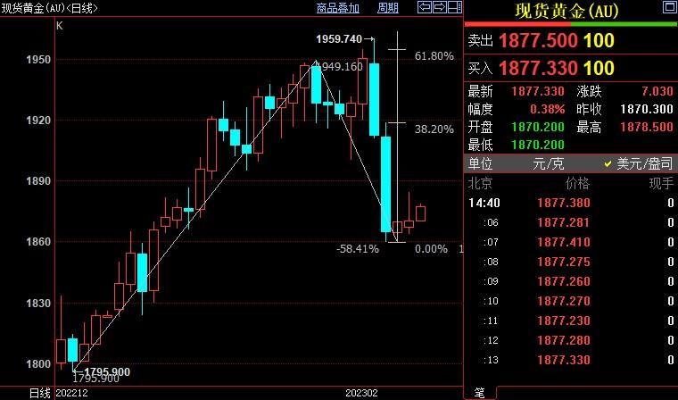 北京时间14:44,现货黄金上涨0.34%至1878.14美元/盎司;COMEX期金主力合约上涨0.30%至1890.5美元/盎司;美元指数下沉0.05%至103.295。