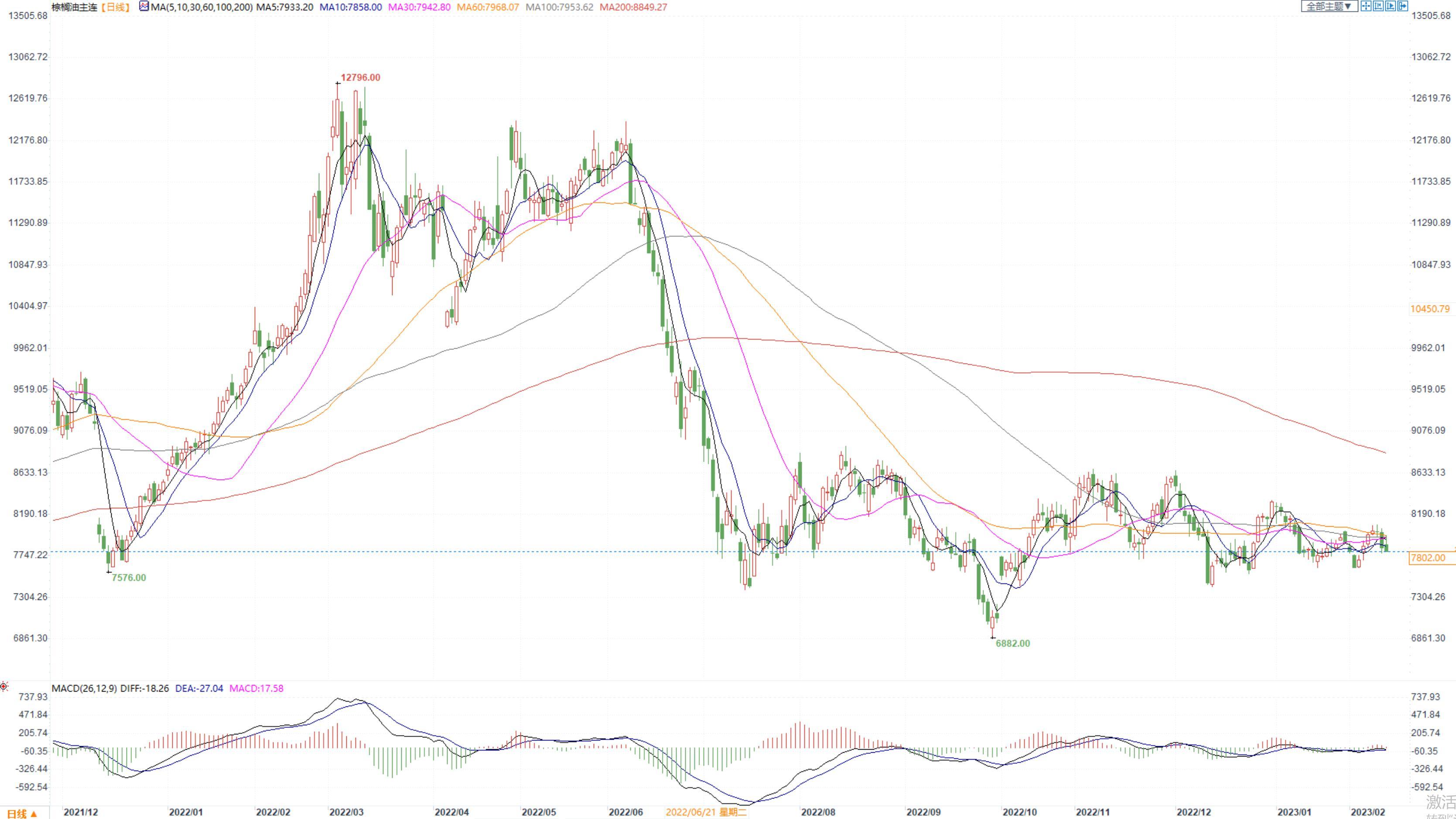 棕榈油2305合约日内跌-1.22%,收盘7802元/吨,广州市场棕榈油7800元/吨。