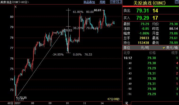 北京时间16:13,NYMEX原油期货下跌1.00%至79.34美元/桶;ICE布伦特原油期货下跌0.62%至86.07美元/桶。