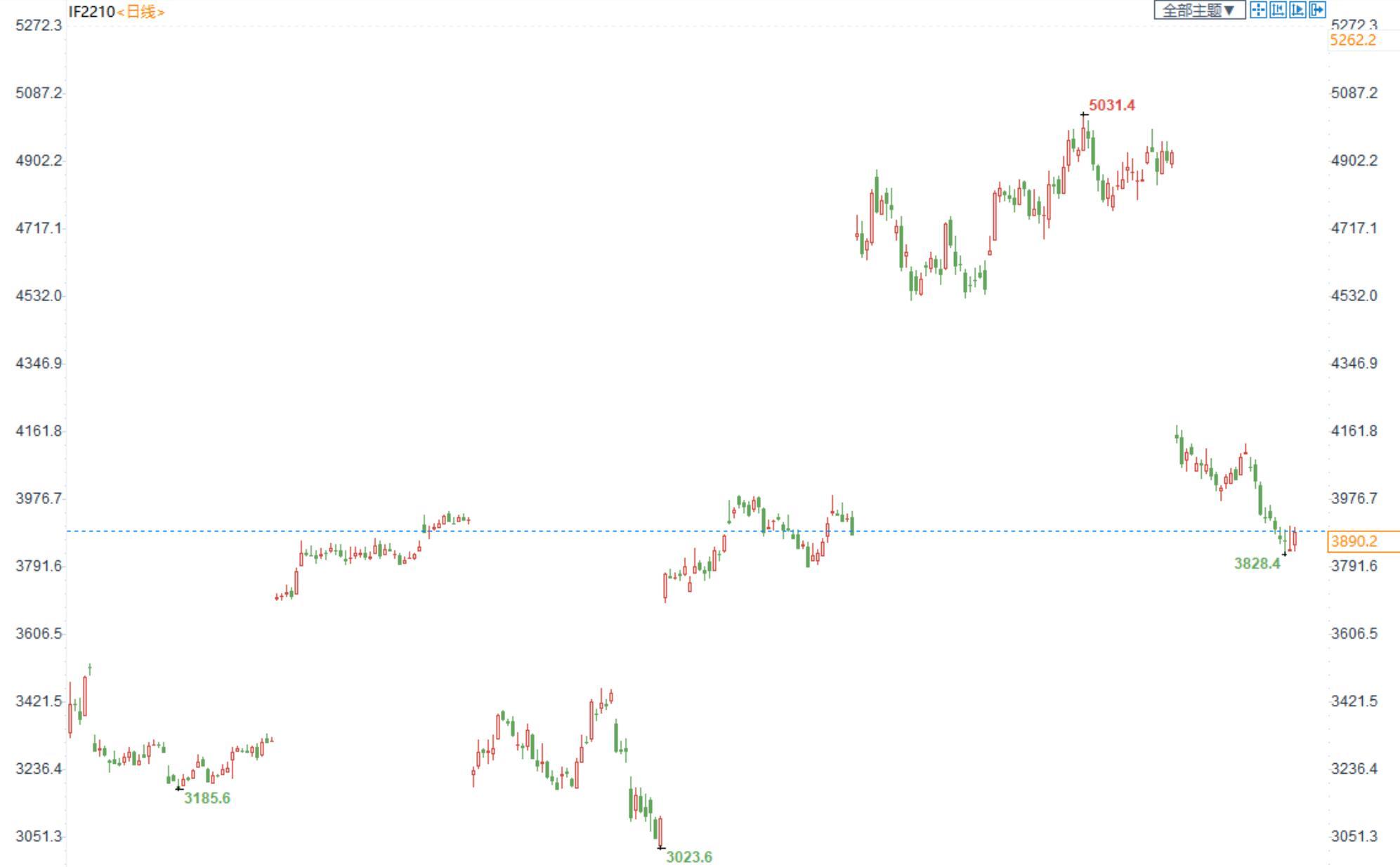 【今日行情】四大期指全线收涨。IH2210收盘价为2642,收涨0.75%;IF2210收盘价为3890.2,收涨1.05%;IC2210收盘价为5912.6,收涨1.62%;IM2210收盘价为6398.8,收涨1.99%。今日市场宽幅震荡,午后强势拉升反弹,基本回补昨日上影线的跌幅,上证综指接近3100点。板块方面,石油石化以及煤炭板块成为唯二收跌的板块,长假临近消费者服务板块连续第二天大涨。市场总成交额缩至6668.74亿元,连续第7个交易日处于6500亿元的地量附近。反弹无量,节前资金还是较为谨慎。