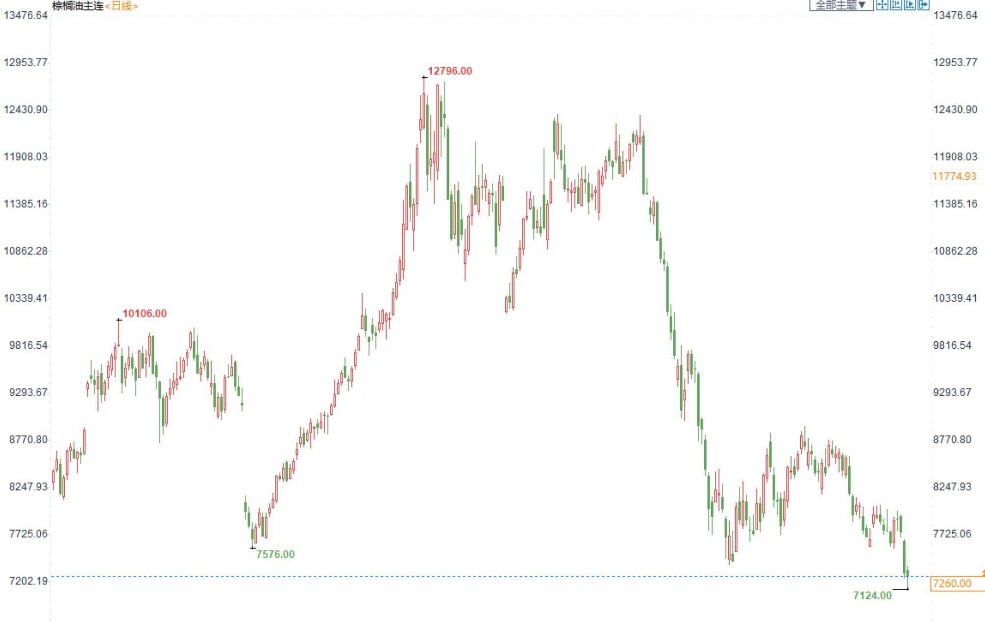 棕榈油2301合约日内跌0.52%,收盘7260元/吨;广州市场棕榈油7555/吨。